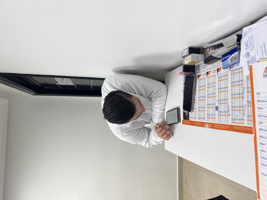 A male individual is depicted in an indoor office environment in Meknes, Morocco. He is positioned leaning forward over a white rectangular desk, wearing a light-colored, long-sleeved top and has dark, slicked-back hair. His left hand is actively engaged with a smartphone, which has an illuminated screen displaying an interface. A second, dark-colored smartphone lies flat on the desk to the right, possibly face-down or with its screen off. The desk also contains an expansive printed document featuring multiple rows of small, numbered blue and orange boxes, with additional white papers beneath it, one partially visible with the word "PLAQUETTES." Office supplies are clustered on the right side of the desk, including three distinct ink stamps with red, yellow, and white bases, a large silver stapler, and a small blue and white box. The background features a plain white wall and a dark-framed doorway positioned on the right side of the frame. A light-colored floor molding runs along the base of the wall.