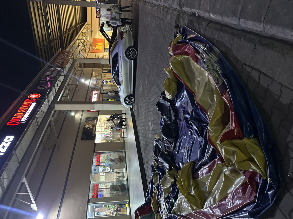 The image depicts a nighttime scene at a retail complex in Ikeja, Nigeria. In the immediate foreground, a large, deflated, multi-colored PVC inflatable structure, primarily blue, yellow, and red, lies collapsed on the dark grey paved ground, extending from the left to the lower right. The midground features a paved area with vehicles and individuals. A silver Mercedes-Benz sedan is parked, facing right, followed by a darker vehicle with its trunk open, parked diagonally behind it. Five male individuals are visible: two are seated on a wooden bench outside a retail establishment, one interacting with a third standing male. Two other males are standing near the open trunk of the darker vehicle, while a fifth male stands further to the right. The background consists of a well-lit, multi-story building housing several retail establishments with illuminated signs. Visible signs include "Pizza," "COLD STONE CREAMERY," "LADY MYA CLOTHING," an unidentifiable "O" (likely "L-D MYA CLOTHING" on the fascia), "SAUCE," and "JARA." An overhead canopy, supported by light-colored pillars, extends from the building, covering the pedestrian and parking areas directly in front of the shops. The ground material appears to be dark grey interlocking pavers.
