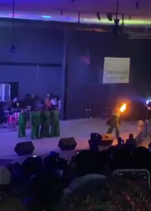 fire dancer on a stage, wearing a green outfit and holding two lit torches. In the background, there's a group of people also dressed in green, standing near a band. A screen behind them reads "THE EAGLES DANCE CREW". The stage is illuminated with stage lights, and in front of the stage, an audience is watching and recording with their phones. The room is large, with a high ceiling and overhead lights. The lighting changes, cycling through colors like orange, blue, and purple.