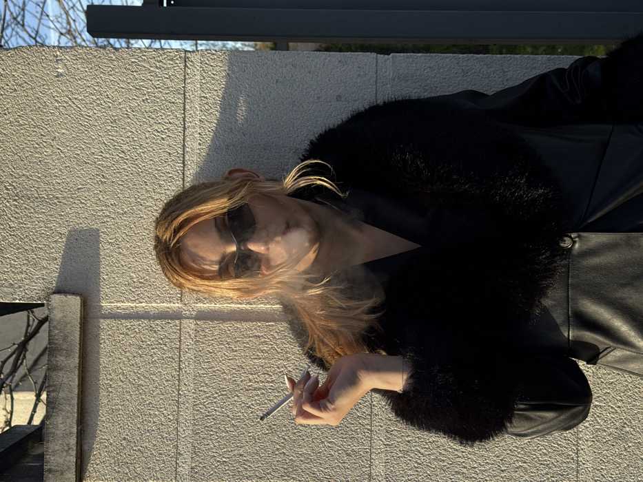 In Asnières-sur-Seine, France, a light-skinned individual, appearing female, stands outdoors during daylight. She wears dark wraparound sunglasses and a black coat with a fur-trimmed collar and cuffs. Her light-colored hair is styled to frame her face. She holds a lit cigarette between the index and middle fingers of her right hand, which displays white-tipped nails, and exhales a plume of smoke directly forward. The individual faces the viewer. Behind her is a textured, light-colored wall with vertical seams, illuminated by strong sunlight that casts a sharp shadow in the upper left background. Beyond the wall, bare tree branches are visible, and to the right, a dark gray vertical structure, possibly part of a gate or fence, is partially visible.
