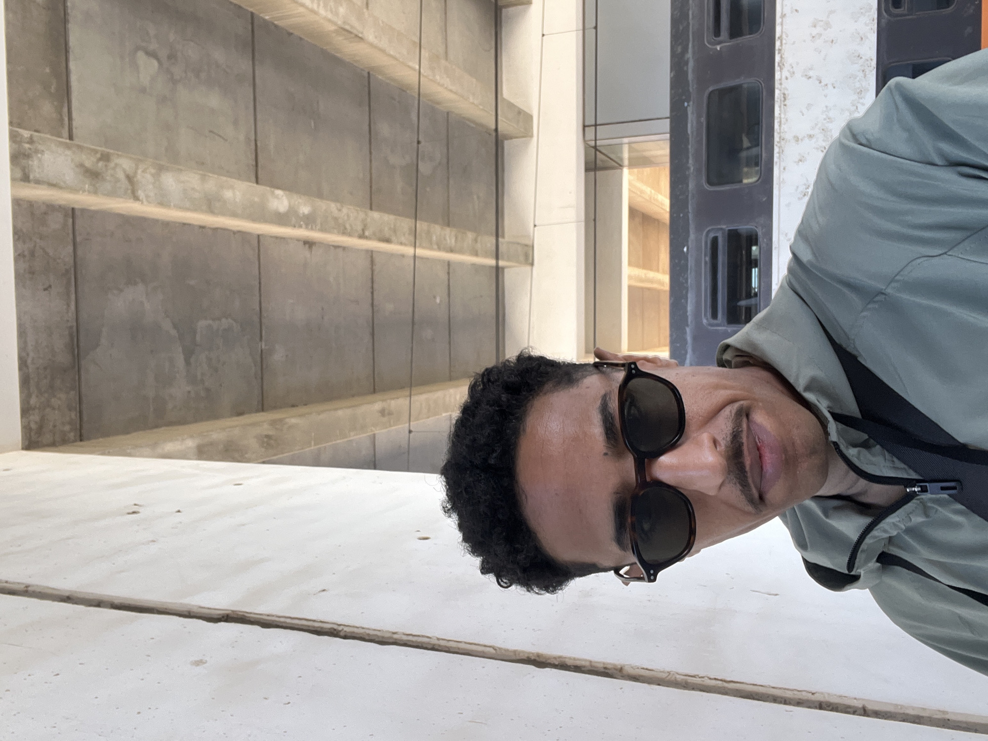 A male individual, approximately 20-30 years old, with dark curly hair and a mustache, is centrally framed. He wears dark-rimmed sunglasses and a light olive-green hooded jacket with a visible black zipper and a black bag strap across his chest. He looks directly at the camera with a slight smirk. To his immediate left is a light-colored, textured concrete wall with a vertical seam. Above and behind him, a raw concrete ceiling structure with prominent parallel beams is visible. In the background, behind the individual's right side, the upper dark section and lower lighter section of a train car, featuring multiple rectangular windows, are partially visible. Further back, above the train, a modern building structure with glass windows can be observed. The environment indicates a railway setting, specifically a train station platform or an area beneath an overpass, situated within the city of Kenitra, Morocco.