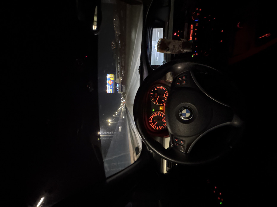 The image depicts the interior of a vehicle, specifically a BMW, from the driver's perspective at night