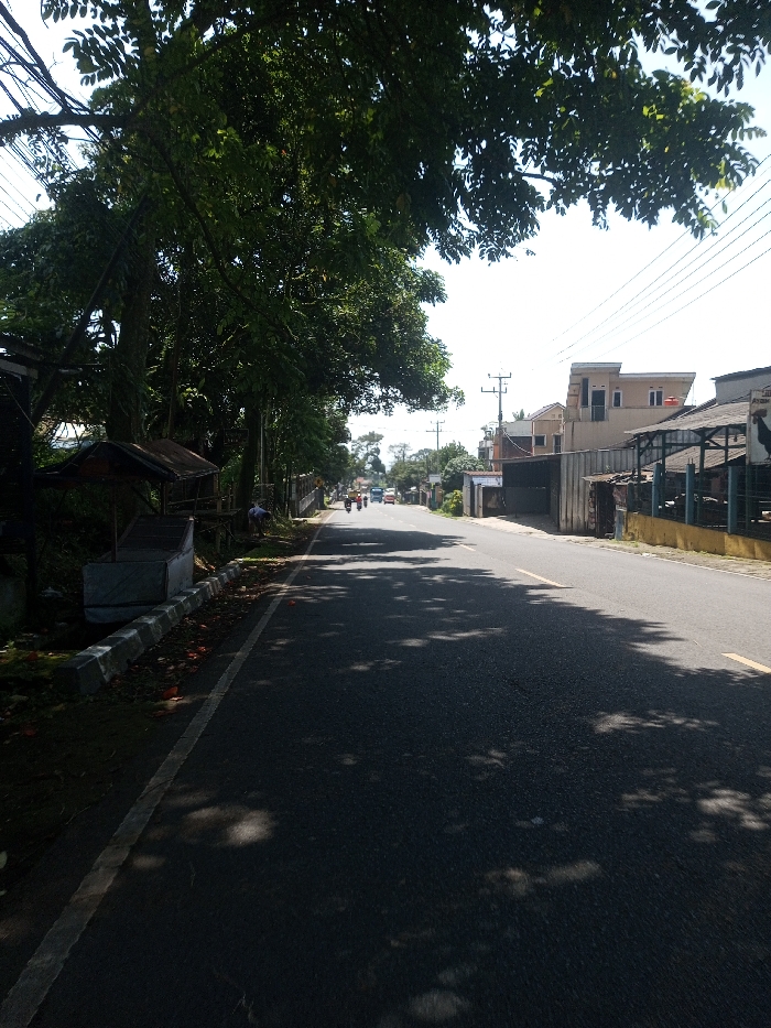 The image depicts a straight, two-lane asphalt road receding into the distance in Beteng_Pangkhar_Somthrang, Bhutan, under a clear, bright sky. On the left side, a dense line of tall, leafy trees casts dappled shadows across the road. Beneath the trees, a white solid line marks the road's edge, followed by a low, two-tiered grey and white concrete curb. Behind the curb, a dilapidated stall with a dark, corrugated metal roof and a grey rectangular container is visible. Further back on the left verge, a single individual wearing a light-colored shirt is seated or crouched near a tree base. On the right side of the road, a solid yellow line transitions into a dashed yellow line in the mid-ground. Adjacent to the road, a series of buildings are visible, including one with a corrugated metal facade and a prominent two-story light-colored building with multiple windows and a flat roof. Further down, another structure with an open-sided roof and a sign depicting a rooster is present. Numerous utility poles with multiple overhead wires line the right side of the street. In the distant center of the road, at least three motorcycles and several cars or vans are traveling away from the viewer. The overall scene suggests a sunny day in a semi-urban environment.