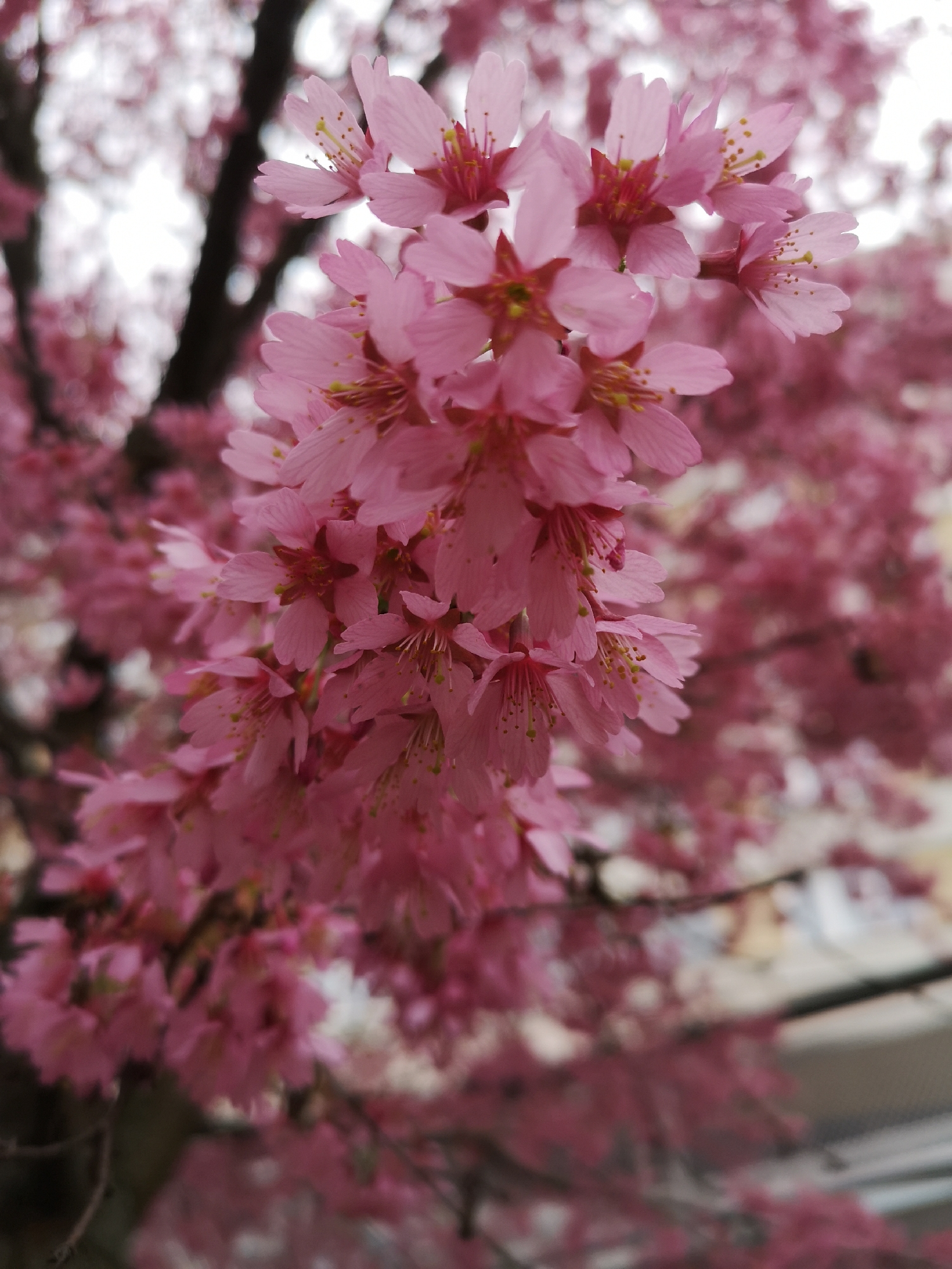 A close-up photograph, taken in Pardubice, Czechia, displays a dense cluster of pink blossoms from a flowering tree. The foreground features multiple individual flowers in sharp focus, each possessing five distinct, light pink petals, a reddish-pink center, and prominent yellow-tipped stamens. These blossoms are arranged along a stem, descending from the upper left towards the lower right of the frame. The background is heavily blurred, exhibiting abstract shapes of more pink blossoms, dark out-of-focus tree branches, and indistinct lighter areas suggesting an overcast sky or a distant building facade. No individuals are visible in the scene.