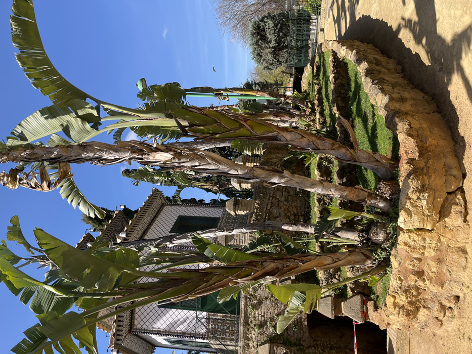The image displays a section of Parque de La Alquería in Dos Hermanas, Spain, under bright daylight with a clear blue sky. In the foreground, a prominent, curvilinear planter bed constructed from rough, light-colored stone contains several mature *Strelitzia nicolai* (Giant White Bird of Paradise) plants, characterized by thick, multi-stemmed trunks and large, intact green leaves. The ground surrounding this planter is a dry, light-brown earthen path, partially shaded. To the left, a decorative, two-story pavilion stands on a raised stone foundation. The building features white walls adorned with a dark, patterned grid, likely mosaic tiles, and an elaborate roofline with intricate tile work and small hanging ornaments. A dark green louvered window or shutter is visible on its façade. Below the building's foundation, an arched opening, possibly leading to an underground passage, is partially obscured by red and white striped caution tape on the far left. In the midground, behind the primary plants, a series of terraced garden beds, also edged with rough stone, hold manicured green grass. Additional *Strelitzia nicolai* plants and various trees, including tall, slender cypress-like specimens, are visible. A tall, dark green lamppost with a curved light fixture is positioned on the right side of the image. The background on the right reveals a dense cluster of trees, varying in foliage and shape, indicative of a larger park area, separated by a dark green metal fence. A faint, dark speck, possibly a bird, is visible in the clear blue sky on the upper right. No individuals or active interactions are present within the scene.