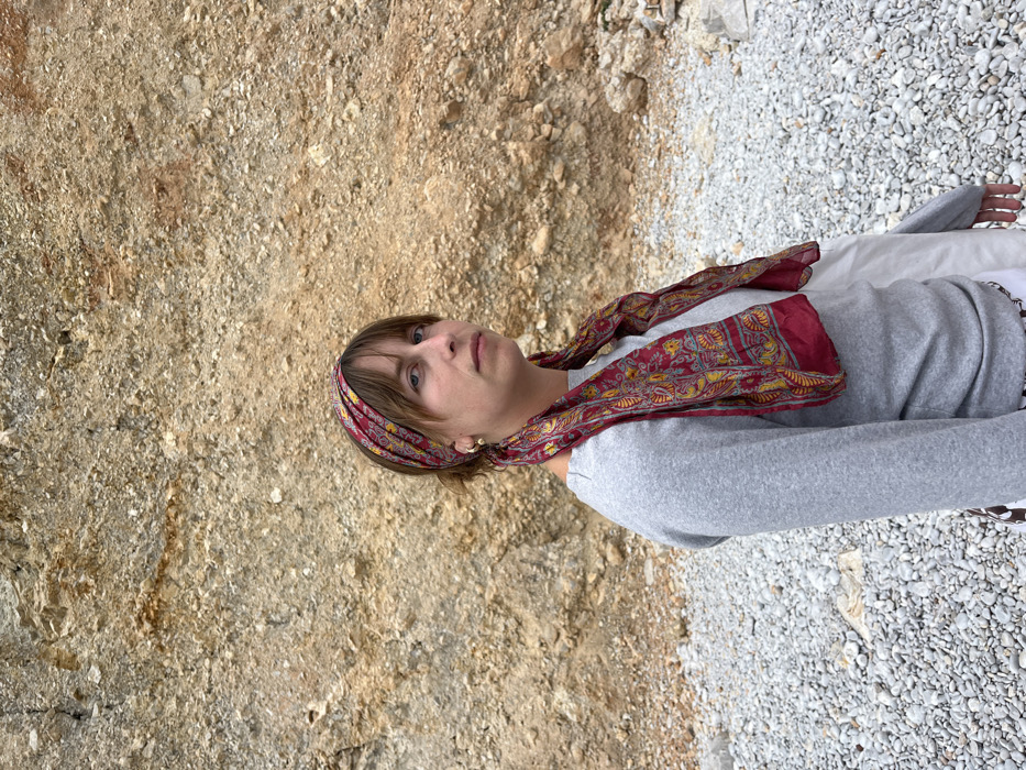 A female subject stands outdoors in the city of Skala, Greece. She has brown hair with bangs and wears a maroon-colored patterned scarf with yellow and blue accents, tied around her head and draped over her shoulders. Small, gold-colored earrings are visible on both ears. She is dressed in a light gray, long-sleeved crew-neck top, with a white garment partially visible underneath on her right side and a dark, patterned waistband or belt around her waist. Her left hand is partially visible at the bottom right of the frame. The subject faces forward with a neutral expression. Behind her is a tall, textured rock face composed of light brown, tan, and gray geological material. The ground beneath her is covered with numerous small, light-colored pebbles and gravel. The scene is illuminated by natural light.