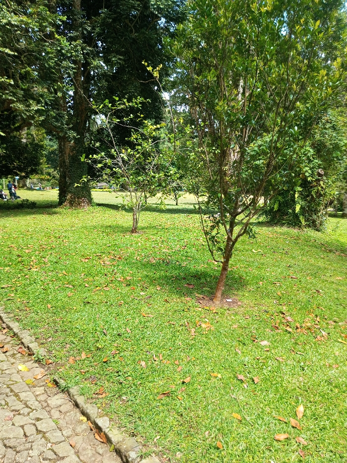 The image displays a daylight scene within a park in Serchhip, India. The foreground features a section of a cobblestone path constructed from irregular grey stones along the lower left. Adjacent to the path, green grass covers the ground, intermixed with scattered dry, brown leaves. A slender tree with a brown trunk and green foliage stands in the mid-right, casting a distinct shadow to its left. Further back, a smaller tree with sparse green leaves is positioned to the left of the foreground tree. A large, mature tree with a thick, dark trunk, partially covered by vegetation, and dense green canopy is visible in the mid-left background. The background consists of additional trees with green leaves. In the far left background, two to three human figures are vaguely discernible on the grass; their specific actions or interactions are not identifiable due to distance and blur.