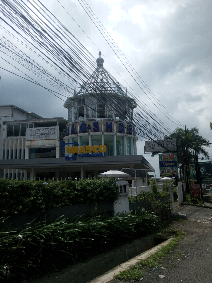 This image depicts an urban scene in Thanthirimale, Sri Lanka, dominated by a multi-story commercial building under an overcast sky. The central structure features a distinctive cylindrical section with large letters spelling "BAG & SHOE" horizontally across its facade, and a blue "BRASCO SUPERMARKET" sign with a shopping cart logo positioned below. The top of this cylindrical section is capped with an elaborate domed, open-lattice framework, culminating in a spire. To the left, an adjacent part of the building shows a sign for "NICOLEE LOUNGE". A dense array of black electrical or communication wires crisscrosses the upper portion of the frame, extending across the sky and over the building. In the foreground, a concrete drainage ditch runs parallel to an unpaved or dirt roadside area. Lush green vegetation, including hedges, low-growing plants, and palm trees, borders the property line of the building. Street-side signage to the right includes "NICOLE'S KITCHEN & LOUNGE" and "TEJAH BRASCO", with a partial view of a larger vertical billboard displaying "SENADA". No individuals are visible in the scene.