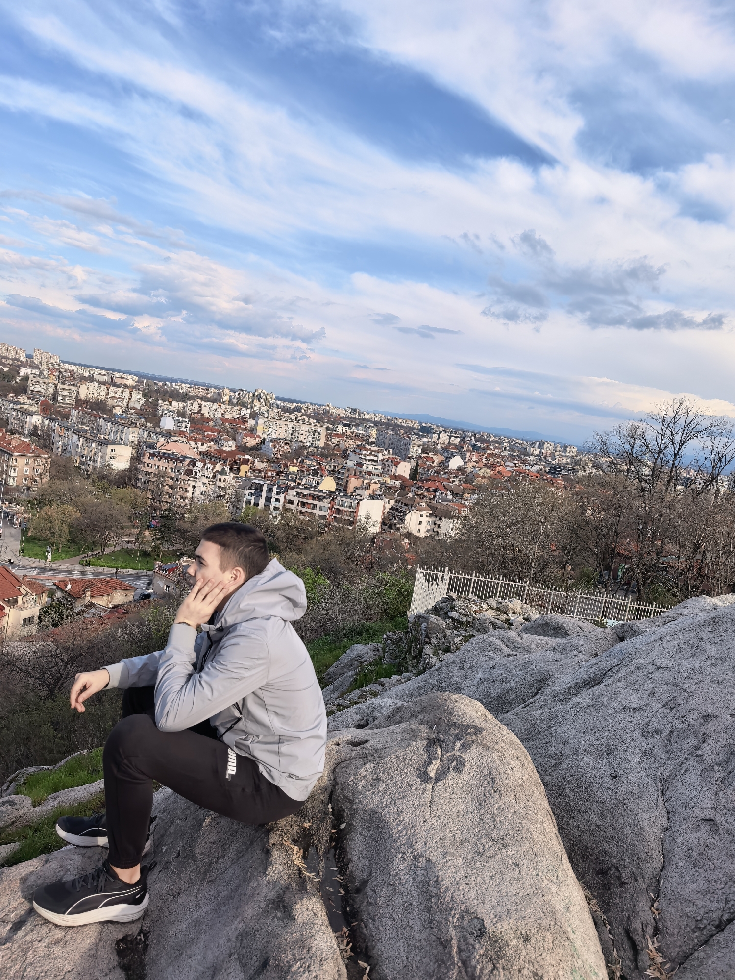 A medium shot captures a young man sitting on a large, light gray rock formation. He faces slightly left, with his hand resting on his cheek in a thoughtful pose. He is wearing a gray hoodie and black pants with Puma sneakers. The backdrop is a cityscape with buildings of varying heights and colors, predominantly light and reddish brown. A cloudy sky fills the upper portion of the frame, featuring light blue interspersed with white and gray clouds. The setting appears to be atop Nebet Tepe in Plovdiv, Bulgaria, based on the recognizable features of the cityscape.