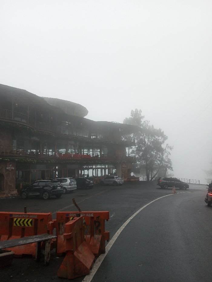 A multi-story building with a unique, curved roofline is shrouded in heavy fog. Several cars are parked in front, and a few more are visible on a road curving away from the building. Orange traffic barriers are positioned along the road's edge, adding a pop of color to the predominantly gray scene. Trees emerge through the mist, adding to the overall atmospheric quality of the image.