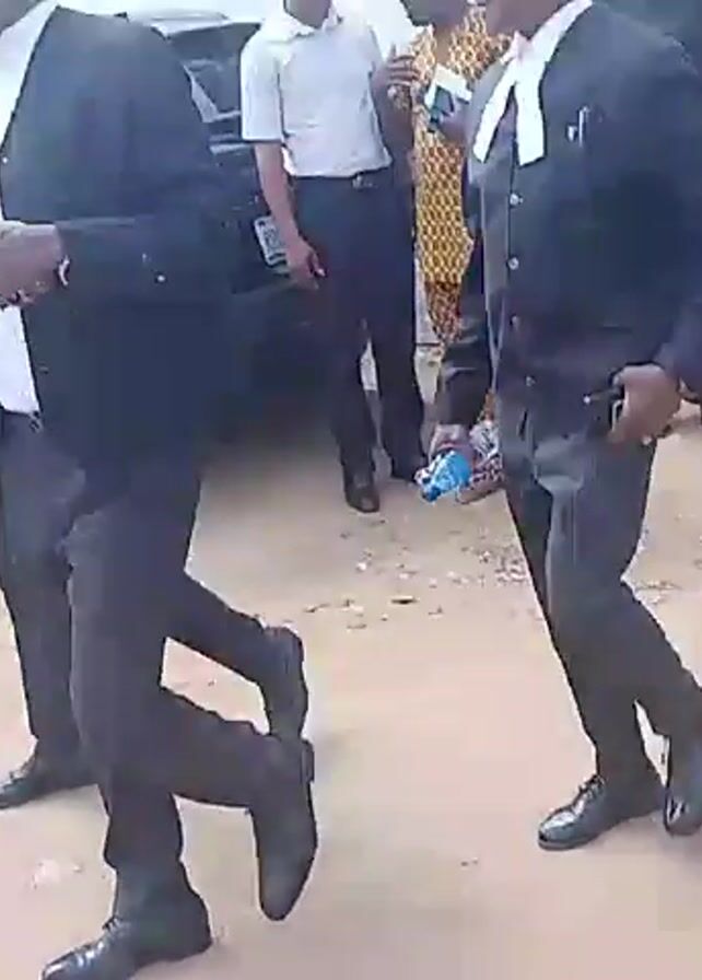 gathering of people, many dressed in formal attire. Some of them are lawyers, recognizable by their black gowns and white collars. Cars are parked nearby, including a van with its trunk open, revealing some equipment inside. A white coffin, adorned with gold, is being carried by pallbearers in navy blue robes. A cameraman is recording the scene. A brass band plays as the casket is carried past onlookers, suggesting a funeral or memorial service taking place outdoors on a sandy, unpaved area.