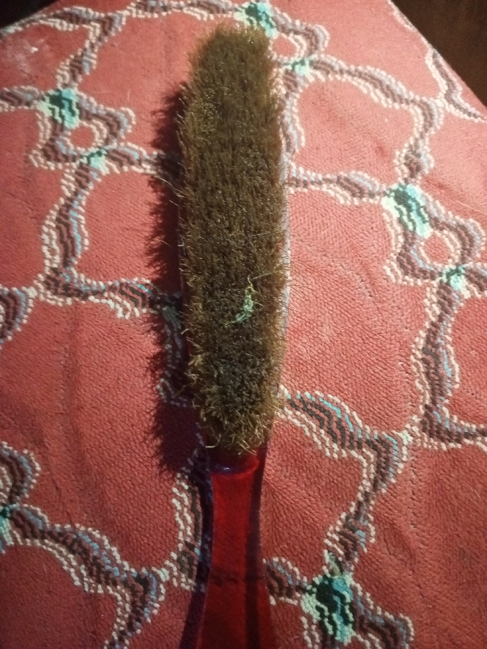 - "A makeup brush with brown bristles and a red handle is placed on a red towel with a patterned design" by FM-dnZ213, licensed under CC BY 4.0