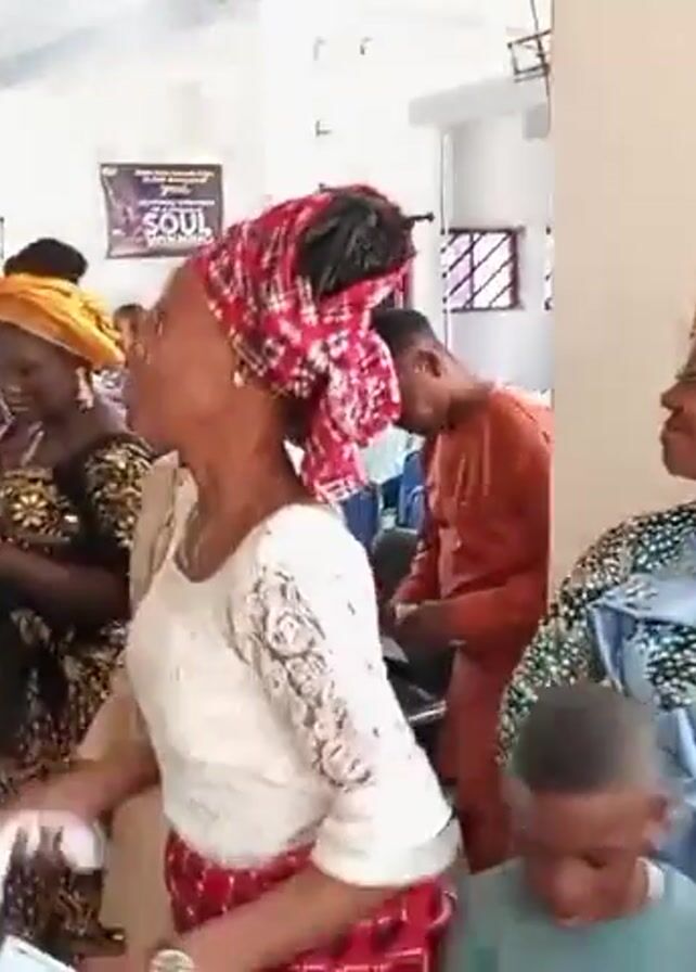 group of people, mostly women, gathered indoors, possibly in a church or community hall. They are dressed in colorful, traditional African clothing, with many wearing headwraps. Some people are dancing, while others are singing and clapping, suggesting a celebratory or religious event. There is a child in the foreground and other individuals visible in the background. The room appears to be well-lit, with white walls.