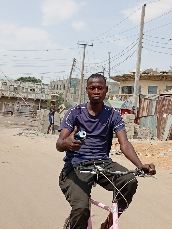 A forensic examination of the image reveals an outdoor scene set on an unpaved dirt road in Sabon Gari West, Nigeria, under a partly cloudy sky. The primary subject is a dark-skinned adult male, centrally positioned, seated on a pink bicycle and looking directly at the camera. He is wearing a dark blue t-shirt with white stripes on the shoulders and dark trousers. His right hand holds a crumpled silver and blue beverage can, with his thumb extended in a positive gesture. His left hand rests on the bicycle's handlebar. In the mid-ground, to the left, a second dark-skinned male, dressed in a red shirt and blue shorts, is visible, appearing to handle grey building blocks. Further in the background, a third dark-skinned male is partially visible near a structure constructed of corrugated metal sheets on the right. The environment consists of various urban buildings: a multi-story structure with "DUE Photo" visible on signage to the left, unfinished concrete block structures, and a light-colored building with multiple satellite dishes on its roof to the right. Numerous utility poles supporting overhead power lines are distributed throughout the background. The ground exhibits scattered debris and construction materials.