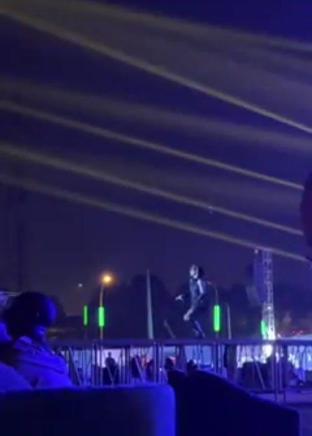 music performance at night, from a vantage point behind a low barrier. A performer, dressed in a short dark dress and boots, is singing on a stage. Bright yellow and white spotlights shine in beams through the night sky above the stage. There are green upright lights behind the stage. Some audience members sit on dark chairs or couches in the foreground. The video is shot at a low angle.