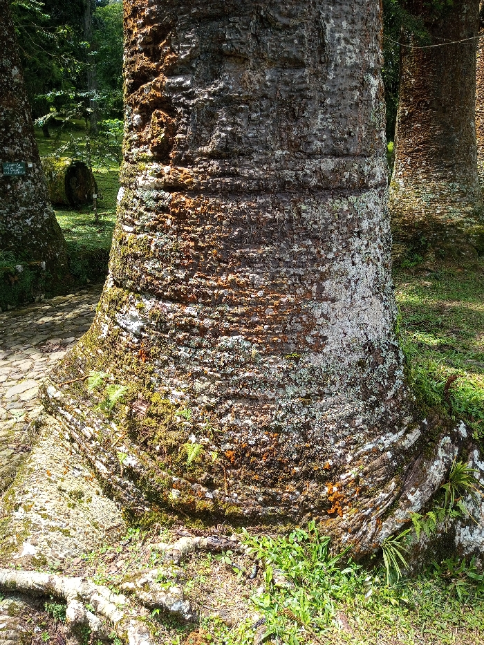 A close-up of a tree trunk reveals textured bark covered with moss and lichen. Horizontal ridges circle the base, where the trunk widens towards the ground. Lush green grass and small plants surround the tree's base, obscuring some roots. Another tree trunk is visible in the background, along with a glimpse of a wooded area. A stone path leads to the left of the primary trunk.