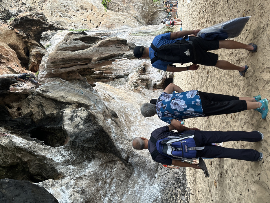 The image depicts a sandy beach area at the base of towering limestone cliffs in Tambon Ao Nang, Thailand. In the foreground, three individuals stand with their backs to the camera, facing the cliffs. The leftmost individual, an older male, wears a dark shirt, dark full-length pants, and grey-soled shoes, with a blue, grey, and white Jansport backpack; he holds black flip-flops in his left hand. The central individual, an older female, wears a short-sleeved blue floral shirt, dark capri-length pants, and light blue athletic shoes, with her hands placed on her hips. The rightmost individual, a male, wears a blue t-shirt, black shorts, and blue flip-flops, a black baseball cap, and a black Adidas backpack; he carries a clear plastic bag containing a dark blue item in his left hand. High on the central cliff face, a rock climber in dark clothing is visible in a crouched position, actively ascending the rock, with climbing ropes visible. To the far right, a group of approximately 5-7 individuals, some equipped with climbing harnesses, are gathered on the sand near the cliff base. The cliffs feature various grey, white, and dark brown rock textures with crevices and stalactite-like formations, while the ground consists of light brown sand.
