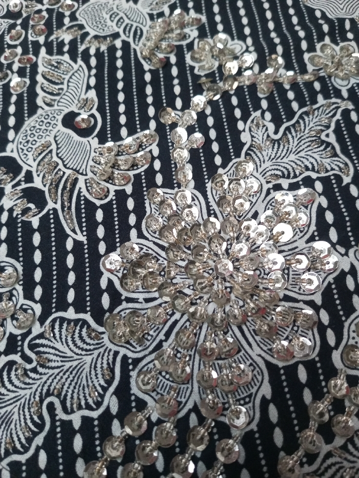 A close-up shot presents a textile with a batik-inspired design. The fabric features a dark background adorned with ornate white patterns resembling floral motifs and abstract shapes. Silver sequins are meticulously sewn onto the fabric, accentuating the design and adding a touch of embellishment. The sequins are clustered together to create focal points and lines that follow the contours of the underlying pattern.