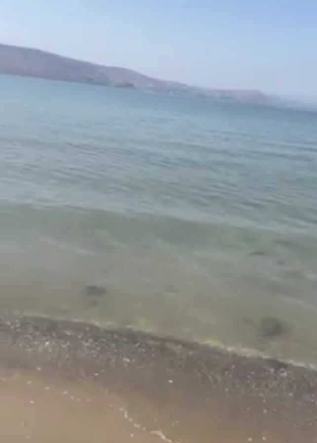 shoreline with a body of water and hills in the background. The camera then focuses on a large, dark-colored catfish lying on the sand and shell-strewn beach. A person’s foot is visible near the fish, and there is fishing equipment nearby.