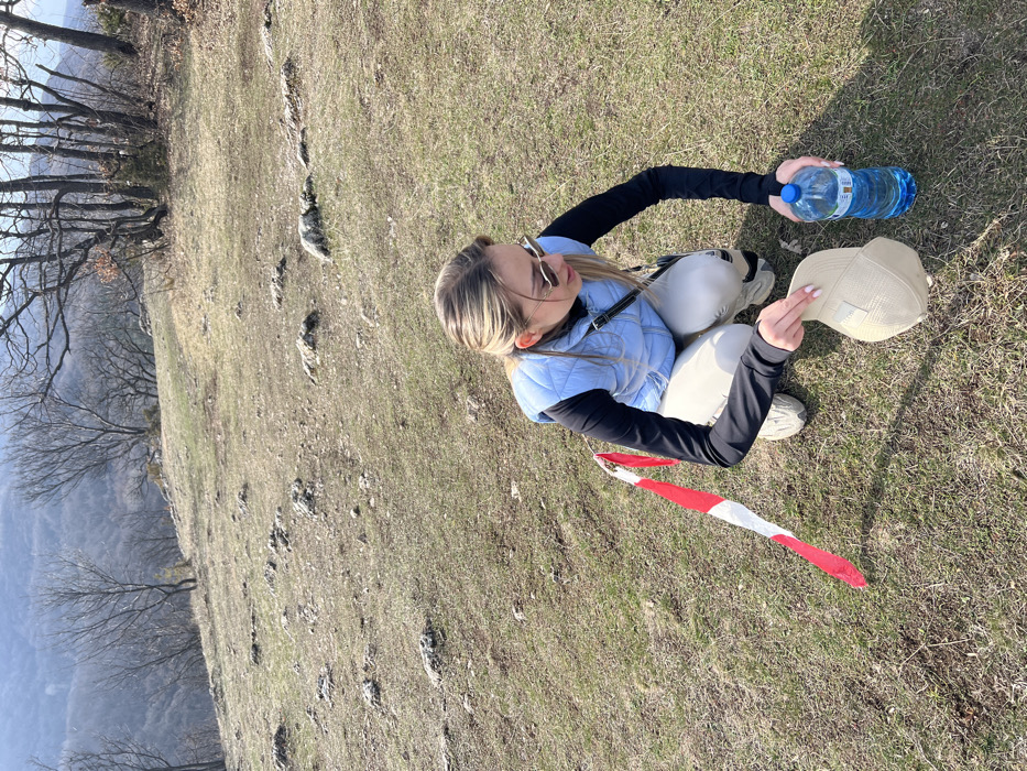 An outdoor scene near Lozen, Bulgaria, depicts a female subject in a squatting position on a sparsely vegetated, rocky hillside. The woman, with blonde hair pulled back, wears sunglasses, a light blue quilted vest over a black long-sleeved shirt, beige pants, and light-colored athletic shoes. She is holding a beige baseball cap in her left hand and reaching for a transparent blue plastic bottle of water with her right hand. To her left, a red and white striped ribbon or tape lies on the ground. The immediate foreground and midground consist of dry grass and scattered small rocks. The background features rolling hills covered with leafless deciduous trees under a clear sky, indicative of a colder season.