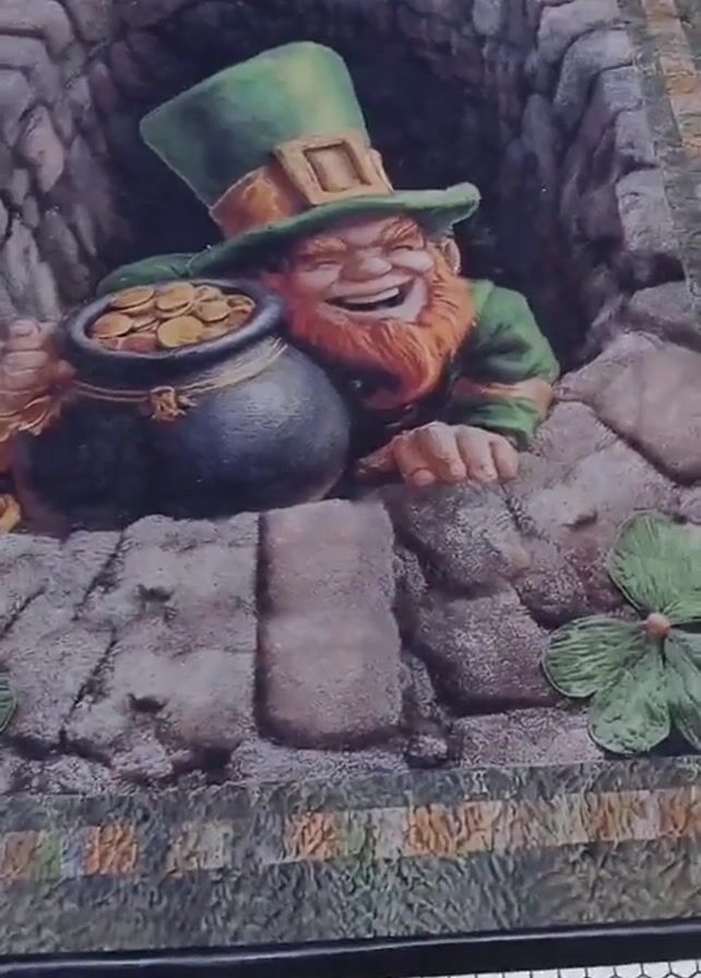close-up of a picture of a leprechaun smiling and clutching a pot of gold. The leprechaun is wearing a green hat and a green outfit. He has a red beard. The pot of gold is overflowing with gold coins. The picture is set against a stone background, and the bottom of the picture has a pattern of green and yellow rectangles. The video is shot from a slightly low angle. The floor beneath the picture is tiled with white hexagonal tiles.
