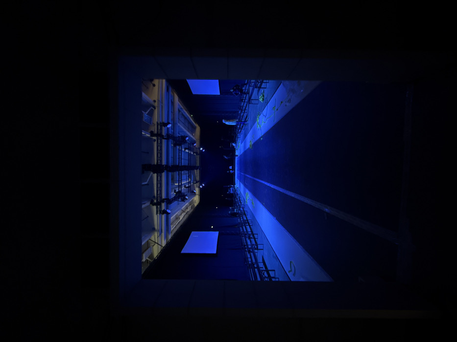 The image captures an indoor event venue, likely located in Issy-les-Moulineaux, France, characterized by a dominant blue lighting scheme. A long, dark, central runway or track, marked with a lighter longitudinal line, extends from the foreground toward the background. On both sides of this runway, multiple rows of dark benches are arranged as seating. The floor areas immediately adjacent to the runway and beneath the benches are bathed in blue light. Overhead, an extensive grid of industrial lighting fixtures and spotlights illuminates the space. Two large, rectangular screens, displaying a solid blue color, are mounted vertically on the side walls further into the venue. Several indistinct human figures are visible; some appear to be standing or moving near the seating areas, while at least one person is seated on the benches on the far right. Green, organic material is scattered across the blue-lit floor areas flanking the runway, particularly on the right side. Yellow arrow-shaped markings are present on the blue-lit floor segment to the left. The scene is framed by a dark, rectangular architectural opening in the immediate foreground.
