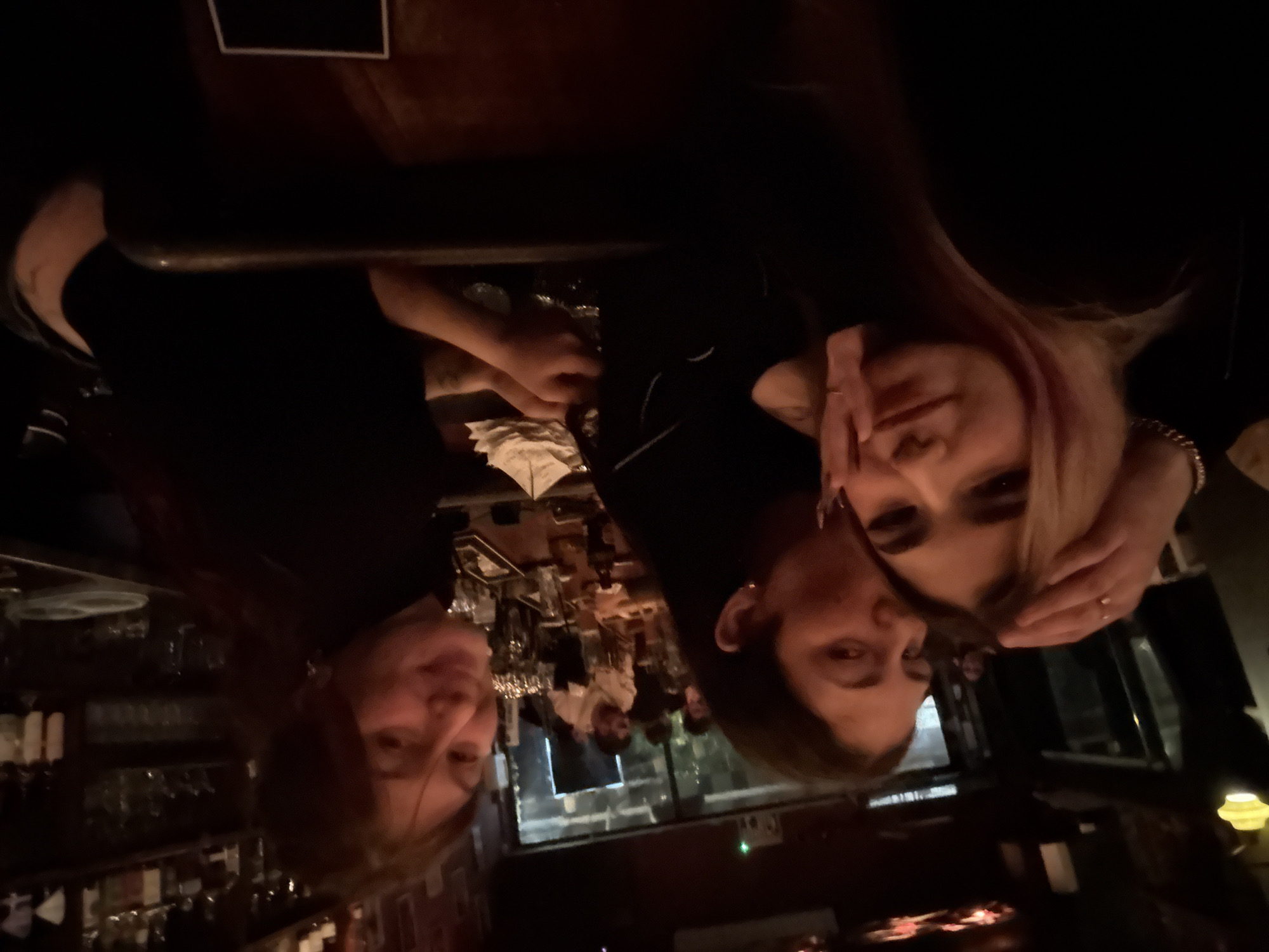 The image depicts three adult females in a dimly lit indoor commercial establishment, likely a bar or pub
