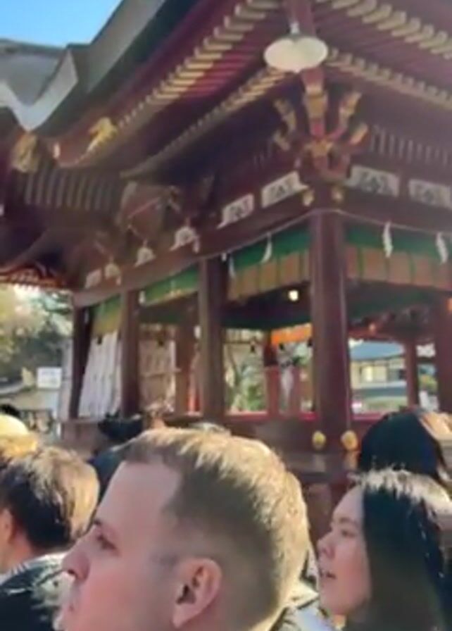 A crowd stands facing a multi-tiered red and green traditional Japanese building in a sunny outdoor setting. People of various ages and ethnicities are visible, some looking at the building, others interacting with each other. The building features ornate details, a traditional roof, and visible individuals inside. The atmosphere is lively, likely due to a special event or ceremony.