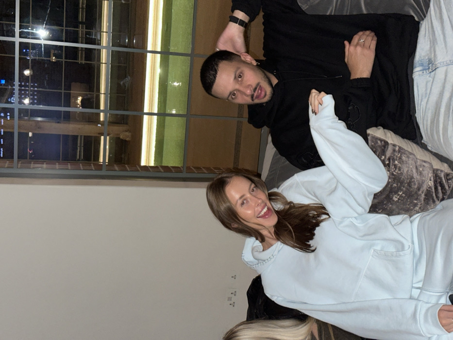 A man and woman are smiling in a casual indoor photo. The man wears a black hoodie and light jeans, while the woman sports a light blue hoodie and matching pants. A window is on the left, reflecting exterior lights. The couple appears relaxed, possibly on a couch with a velvet pillow. The woman has long brown hair. The man has short dark hair and facial hair. Their clothing suggests a comfortable, informal setting.