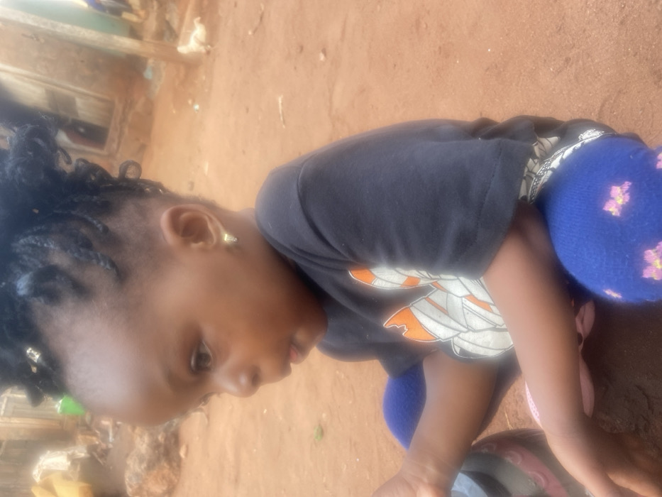 A young child with braided hair and a small gold earring is kneeling outdoors on a dirt ground