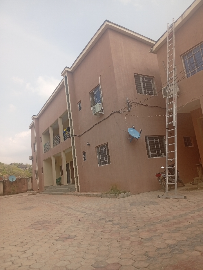 The image depicts a two-story residential or commercial building with a brown-tan stucco exterior and white trim in Lokoja, Nigeria