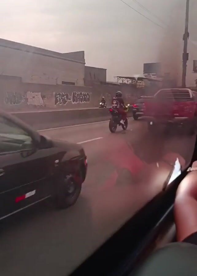 vehicle moving on a road, as seen through its side window. Outside, a black sedan is visible on the left, followed by a red pickup truck passing on the right. Further ahead, a motorcycle moves along the road. The weather appears overcast or hazy. The reflection of the car's interior is visible in the window, including the viewer's arm and a portion of the seat.