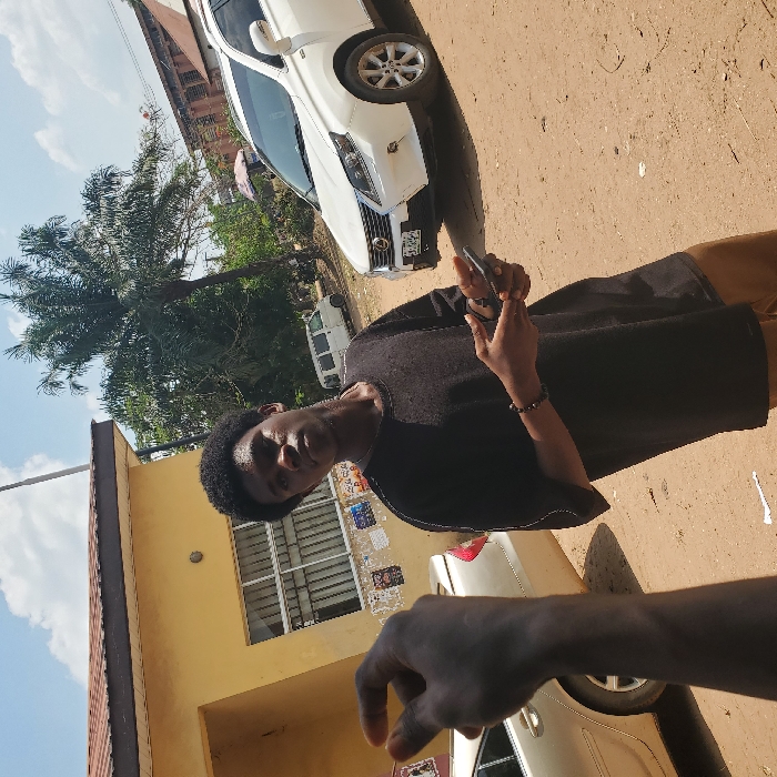 A young man holds a phone, partially facing the viewer, standing on a sunny street. A white car is parked behind him at an angle, while a building with windows adorned with posters is visible in the background. Another car is slightly visible in the foreground, next to an arm and hand reaching into the frame. The background includes a tree, the sky, and the street.