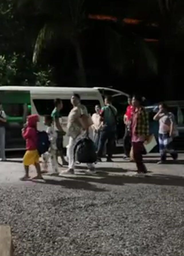 At night, a group of people exit a white van parked on a gravel lot. There are adults and children, some carrying bags or wearing backpacks. One woman walks towards the camera. Palm trees are visible in the background, and a smaller vehicle is parked nearby. The area is illuminated by dim artificial light.