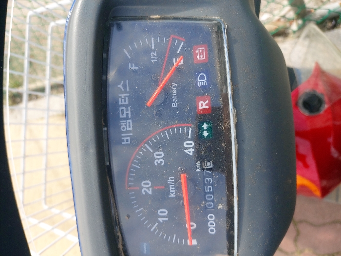 A close-up, high-angle view captures a dusty black instrument cluster belonging to an electric scooter or similar compact vehicle, located in 강화군, South Korea. The speedometer's red needle indicates approximately 10 km/h, with the dial marked up to 40 km/h. A digital odometer displays "005376 km". An analog battery gauge shows a red needle positioned towards "E" (Empty), indicating a low battery charge. The cluster prominently features the Korean text "비엠모터스" (Biem Motors) at the top. Other visible indicators include "Ready" on the left, unilluminated green left and right turn arrows, an unilluminated red "R" for reverse, an unilluminated blue headlight symbol, and a red battery warning symbol. A portion of a white wire mesh basket is visible above the cluster, while a red section of the vehicle's body, incorporating a black circular component (possibly a charging port or keyhole), is visible below. The underlying surface appears to be reddish-brown paving stones.
