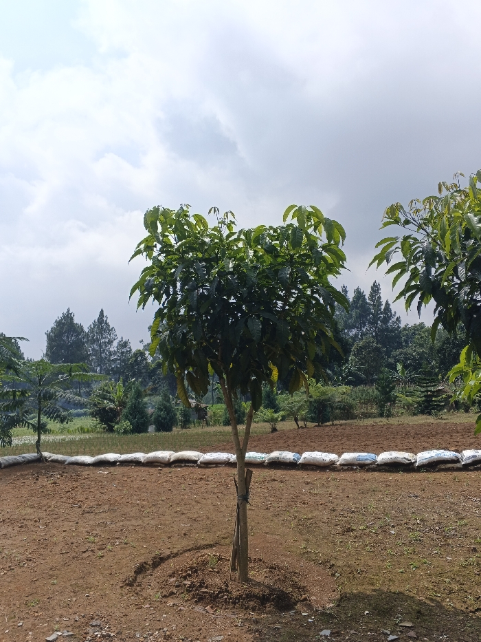 A young tree stands in a bare field with reddish-brown soil. A line of white sandbags stretches across the midground. Other trees dot the landscape in the background, including some pines. The sky is overcast with white clouds. The tree's trunk is supported by a rope. It has a dense canopy of green leaves. Another similar tree is visible on the right side of the image.