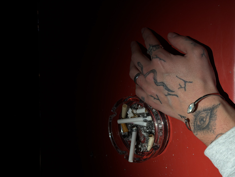 An image displays a tattooed hand above an ashtray full of cigarette butts