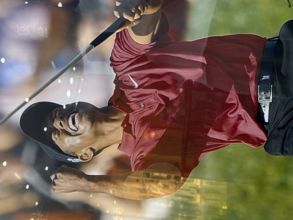 The image depicts a large, glossy display of professional golfer Tiger Woods captured in a moment of exultation