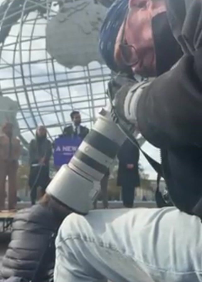 A cameraman with a large lens kneels, taking photos of a man in a suit who is speaking at a podium. Two women stand behind him. The podium has a sign that reads "A New Era for New York City." The scene takes place in front of a large metal globe.