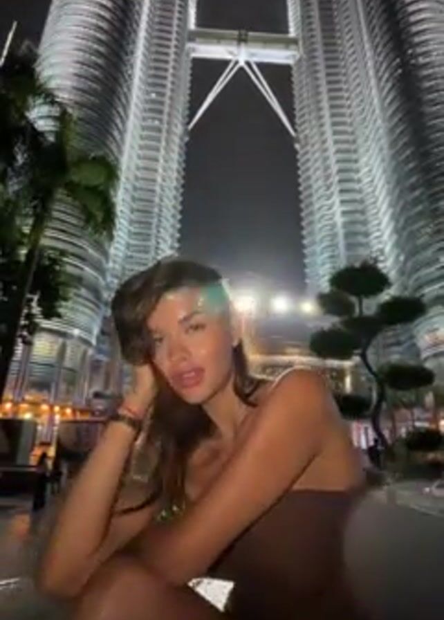 A woman with long brown hair is seated, facing the camera, in front of the Petronas Twin Towers in Kuala Lumpur, Malaysia at night. She is wearing a brown strapless dress. Her left hand is raised near her face, and she smiles at the camera at times. The towers are illuminated against the dark sky, and there are some palm trees and other greenery around her.