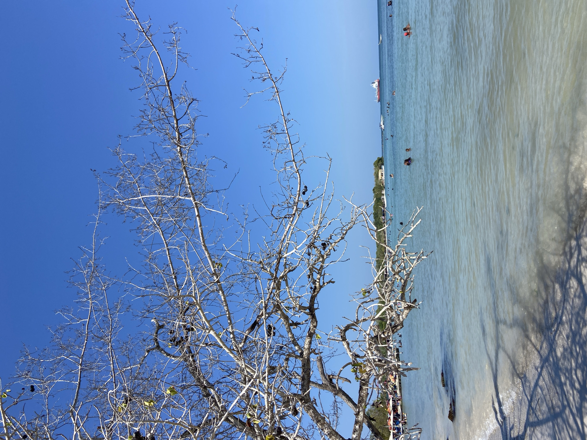 The scene depicts a beach in Los Totumos, Venezuela, on a clear, sunny day. The focus is on a bare, leafless tree in the foreground against a bright blue sky. The background reveals a beach with light-colored sand, calm water with several people swimming or wading, and a few boats in the distance. The perspective is slightly tilted, showcasing the clear sky, the tree branches extending toward the beach and water, and the beachgoers enjoying the day. Shadows of the tree are visible on the sand and in the water. A few buildings are seen along the shoreline, interspersed with vegetation.