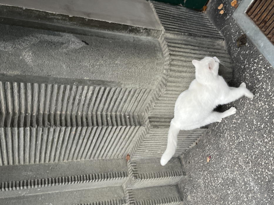 - "An outdoor scene in the City of Zagreb, Croatia, displays a white domestic cat standing on a speckled grey concrete sidewalk" by FM-RPBd82, licensed under CC BY 4.0
