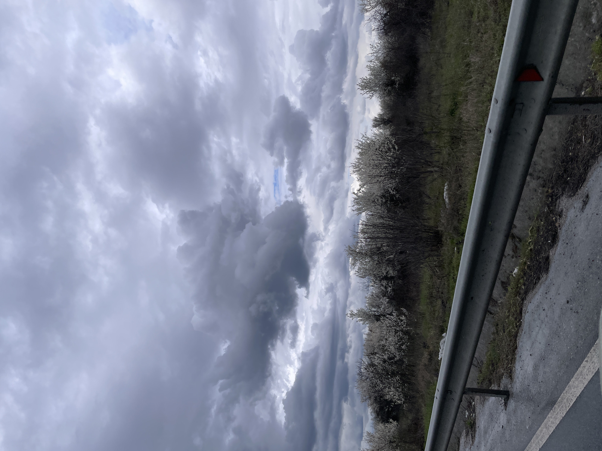 This image portrays a roadside scene in Stamboliyski, Bulgaria, under a predominantly overcast sky. Heavy, dark grey clouds fill the upper portion of the frame, revealing a small segment of light blue sky towards the top center-right. The immediate foreground features a wet asphalt road surface with a visible white lane demarcation on the left. A galvanized metal guardrail, showing signs of wear and equipped with a red triangular reflector on its right end, spans horizontally across the lower mid-ground. Behind the guardrail, a narrow strip of unkempt ground comprises dry grass, scattered refuse including white plastic debris, and a concrete drainage channel. The background consists of a dense row of deciduous trees and shrubs, many exhibiting a full bloom of small white flowers. No individuals are depicted, and no specific actions or interactions are evident within the scene.