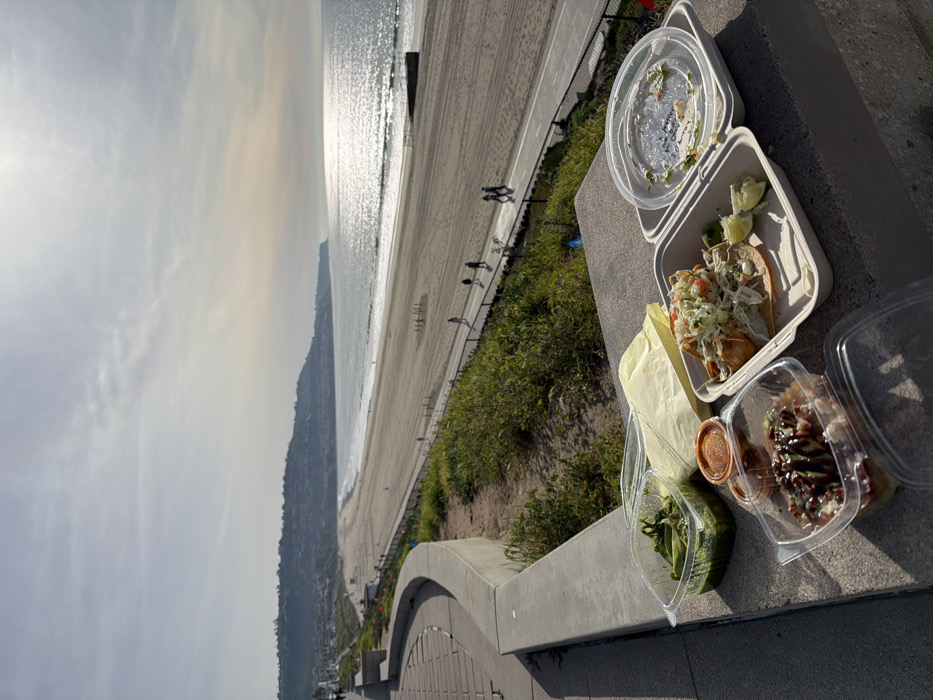 A view of a beach and ocean on a sunny day. A low wall sits between a walkway and the beach, with food containers resting on the wall. The containers hold tacos, a small salad, and another dish with a dark sauce. Some containers are partially eaten or have their lids removed. People walk along the beach in the distance.