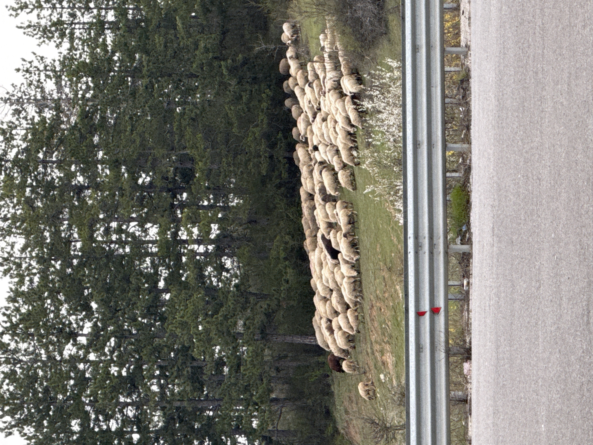 flock of sheep grazing on a grassy area beside a road in what is presumed to be Yablanitsa, Bulgaria. The flock consists mostly of light-colored sheep. There are also one or two darker sheep. A forest with tall trees lines the opposite side of the sheep. A grey metal guardrail separates the grassy area from the paved road, which is on the right.