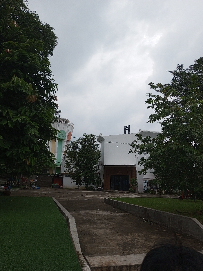 An outdoor scene in Cianjur, Indonesia, is depicted under an overcast sky. In the immediate foreground, the top of a person's dark-haired head is visible in the lower right. A concrete curb separates a strip of artificial green turf on the left from a worn, dark-colored path composed of dirt and concrete, which extends into the midground. Lush green trees with dense foliage flank the path on both sides. In the midground, a group of indistinct individuals appears to be seated on the ground or low structures to the left, near some colorful objects. Two distinct buildings dominate the background. On the left, a multi-story structure exhibits a unique architectural design with curved, pastel-colored sections (light green, yellow, white) and a rounded top section featuring a railing. To the right, a modern, white building with a curved facade is present. Its recessed entrance is dark, possibly composed of glass, beneath a brown-textured overhang, with a single exposed light bulb hanging above. On the flat roof of this white building, two dark, upright human-like figures are standing, facing away from the viewer.