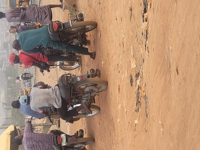 A busy street scene depicts several motorcycles lined up, each with a driver. The drivers are wearing casual clothing, including t-shirts, shirts, and hats. The motorcycles appear to be older models. The background shows buildings and other vehicles, creating a crowded urban environment. The ground is dirt or sand, suggesting a less developed or rural area. The overall impression is of a bustling local transportation hub.