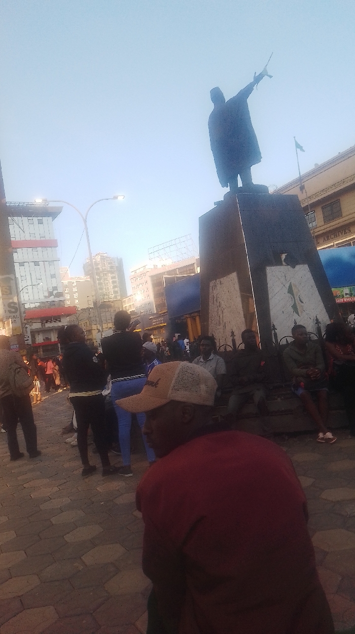 The image depicts an outdoor urban plaza at the Jomo Kenyatta Statue, located at the Kenya National Archives intersection in downtown Nairobi, Kenya