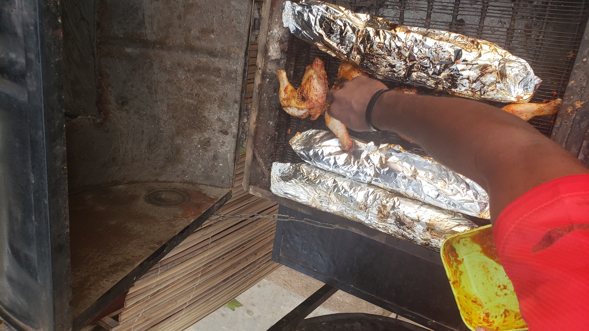 A high-angle perspective captures an outdoor grilling operation in Narayi, Nigeria. A person's right forearm, adorned with a black wristband, extends into the frame, manipulating food items on a dark, rectangular metal grill. The individual wears a red short-sleeved garment, partially visible on the lower left. On the grill's gridded surface, four elongated items wrapped in aluminum foil are arranged. The package on the far right appears heavily charred or coated in a dark substance, contrasting with the three adjacent packages that retain their bright, reflective silver appearance. Interspersed with the foil-wrapped items are several pieces of seasoned, partially cooked chicken, exhibiting browning on their skin. The grill's interior walls are dark, stained, and show signs of charring and potential rust. A metal chain hangs vertically on the left side of the grill structure. In the lower-left corner, a yellow plastic container holds a quantity of reddish-orange sauce or marinade, partially obscured by the person's arm and garment. The background reveals a vertical screen or fence constructed from light-colored wooden or bamboo slats, with a lighter ground surface visible beyond.