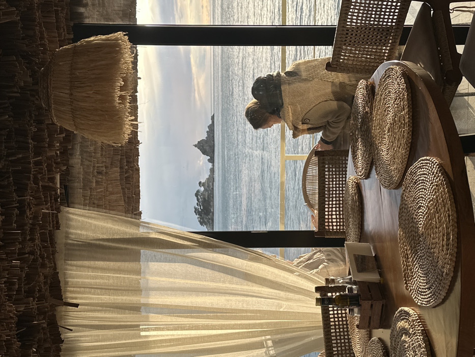 The image depicts an interior dining area in Petrovac centar, Montenegro, overlooking the Adriatic Sea. In the foreground, a large circular wooden table is furnished with eight individual circular placemats made of woven natural fibers. A small wooden caddy on the table contains two bottles (one dark, one clear) and a stack of white napkins. Woven chairs with geometric patterns on their backs are positioned around the table. To the far left, a sheer, floor-length, cream-colored curtain hangs. The ceiling is clad in woven thatch or straw, from which a large, bell-shaped pendant light fixture, also of woven straw, is suspended in the upper right quadrant. Through the expansive windows, two individuals are seated with their backs to the viewer, facing the sea. The person on the right is wearing a light-toned, textured outer garment with a darker neck detail and appears to be observing the view. The second person, seated to their left, is partially obscured. The exterior view displays the calm, sunlit sea, with a metallic railing visible just above the water level. In the distance, two rocky islets are prominent: the tree-covered island of Sveti Nedelja to the left, and the island of Katic to the right, featuring a small chapel structure atop its peak. The sky above the horizon is partly cloudy, illuminated by soft natural light.